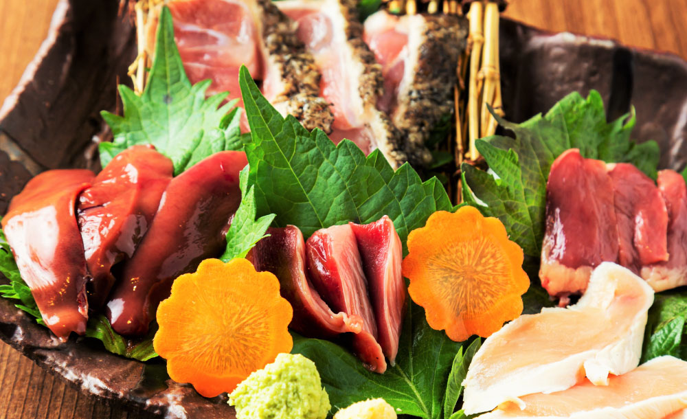 - ※衛生管理には十分注意しておりますが、鶏刺しは 生ものですので、体調がすぐれない方、ご高齢の方、お子様、鶏 刺しが苦手な方は、他のメニューに変更できますのでお申しつけください